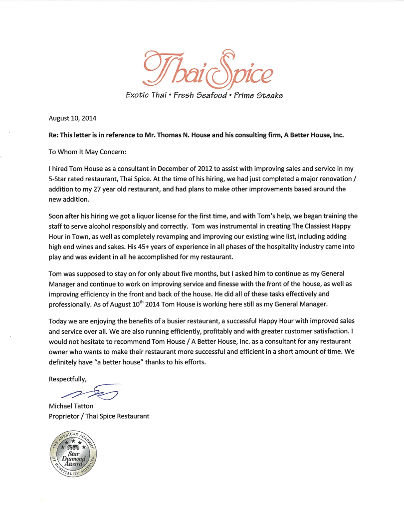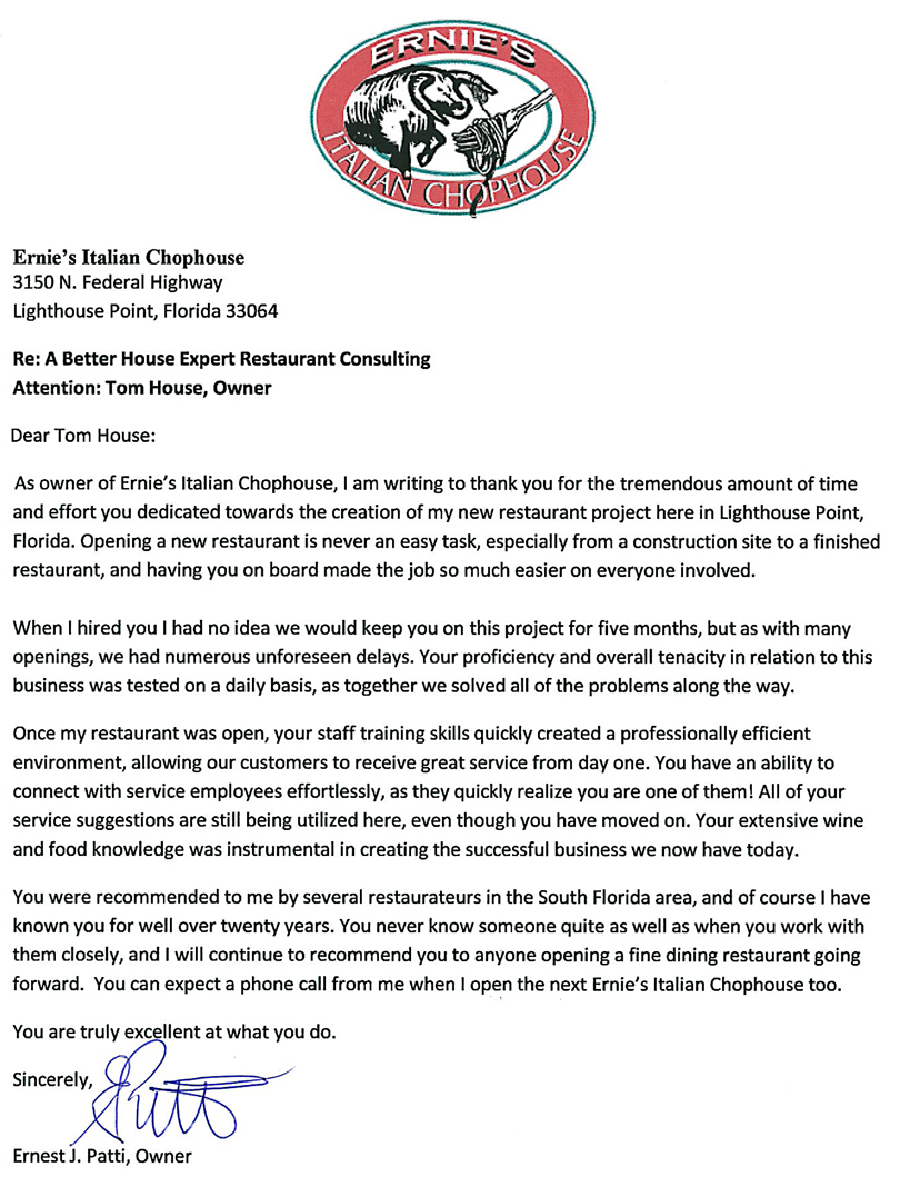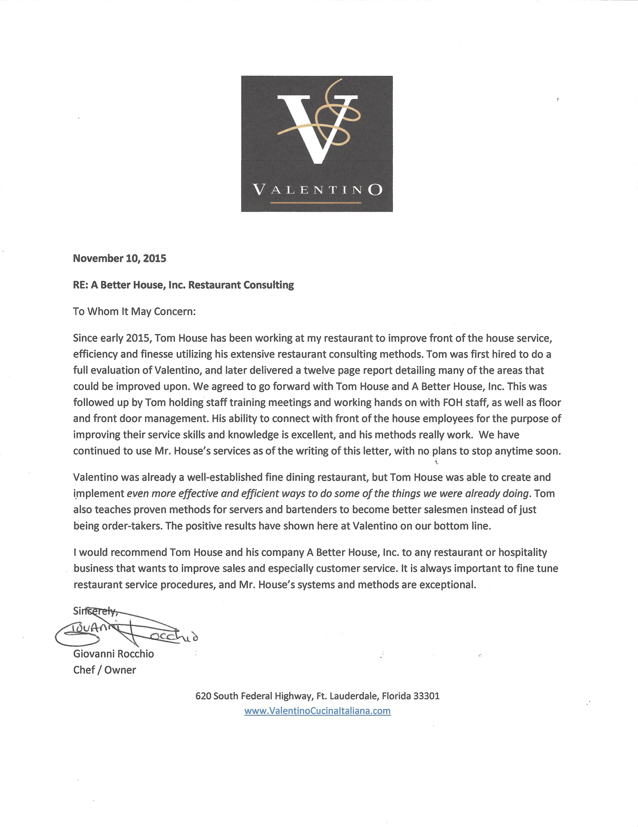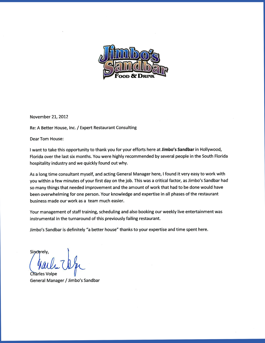 A Better House, Inc. is a full service restaurant and nightclub consulting firm. Founder and President Tom House brings more than 48 years of experience in all phases of the hospitality industry to his numerous clients. Tom has worked, opened and consulted for many of the most famous restaurants and nightclubs in the South Florida area over the last 4 decades, including Hidden Harbor Restaurant, Yesterday's, September's, G. Willikers, G. Wizz, Facade, East City Grill, Cafe Maxx, Hot Chocolates, 32 East, Vic & Angelo's, The Office, Burger Fi, Jimbo's Sandbar, Bobbie Sue's BBQ, Revolution Nightclub, Gryphon Restaurant & Club, Ernie's Italian Chophouse, Coco Asian Bistro, Thai Spice, The Little Chalet, Yakuza Modern Japanese and Thai Restaurant, One Door East and Valentino Cucina Italiano just to name a few. Please see the section of this website dedicated to some of the many accolades and letters Tom has received over the years from some of these satisfied clients.