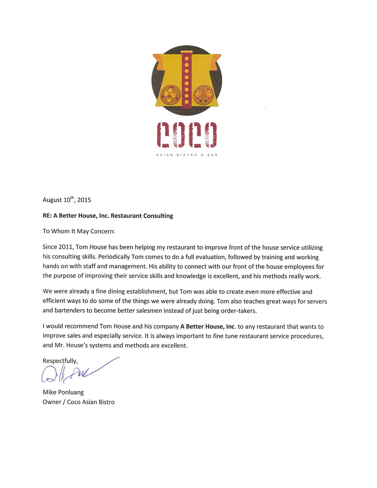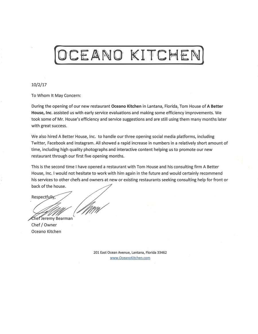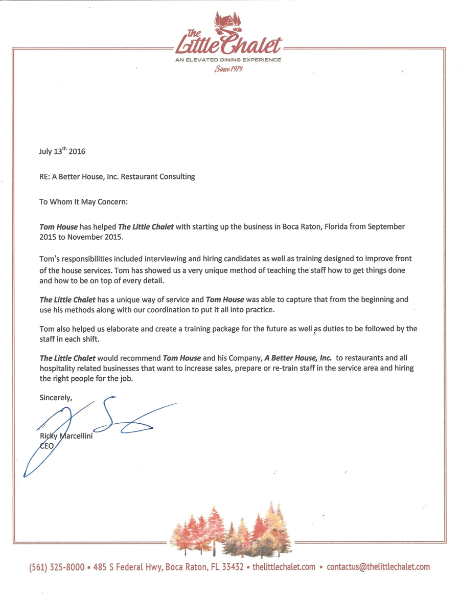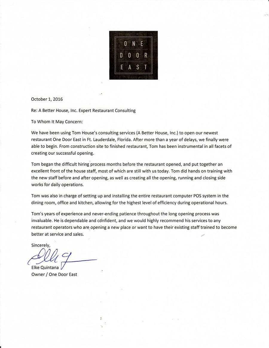 A Better House, Inc. is a full service restaurant and nightclub consulting firm. Founder and President Tom House brings more than 48 years of experience in all phases of the hospitality industry to his numerous clients. Tom has worked, opened and consulted for many of the most famous restaurants and nightclubs in the South Florida area over the last 4 decades, including Hidden Harbor Restaurant, Yesterday's, September's, G. Willikers, G. Wizz, Facade, East City Grill, Cafe Maxx, Hot Chocolates, 32 East, Vic & Angelo's, The Office, Burger Fi, Jimbo's Sandbar, Bobbie Sue's BBQ, Revolution Nightclub, Gryphon Restaurant & Club, Ernie's Italian Chophouse, Coco Asian Bistro, Thai Spice, The Little Chalet, Yakuza Modern Japanese and Thai Restaurant, One Door East and Valentino Cucina Italiano just to name a few. Please see the section of this website dedicated to some of the many accolades and letters Tom has received over the years from some of these satisfied clients.