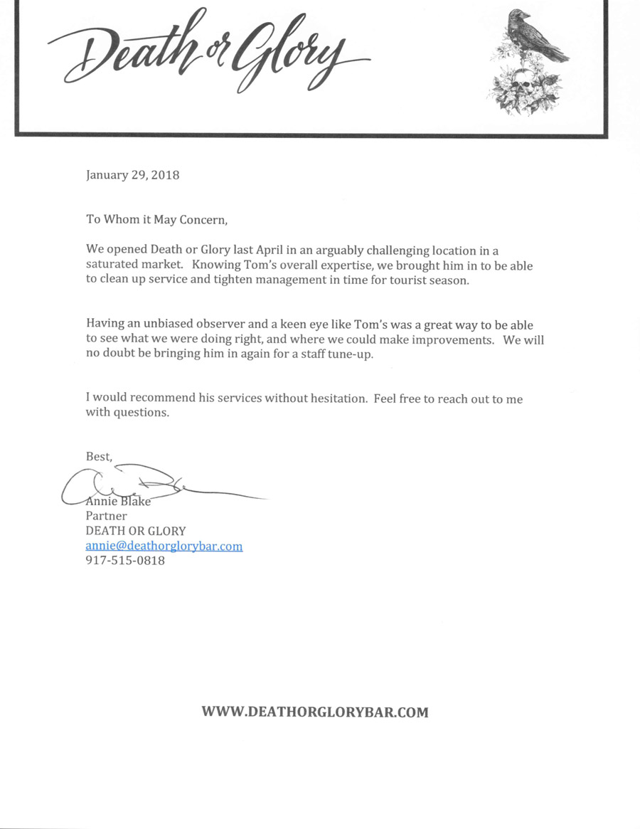 An unbiased eye for detail, Tom improved our service and staff expertise at Death or Glory. It was the perfect training for our staff before tourist season, and we'll be doing it again!