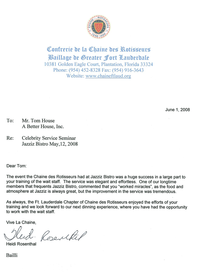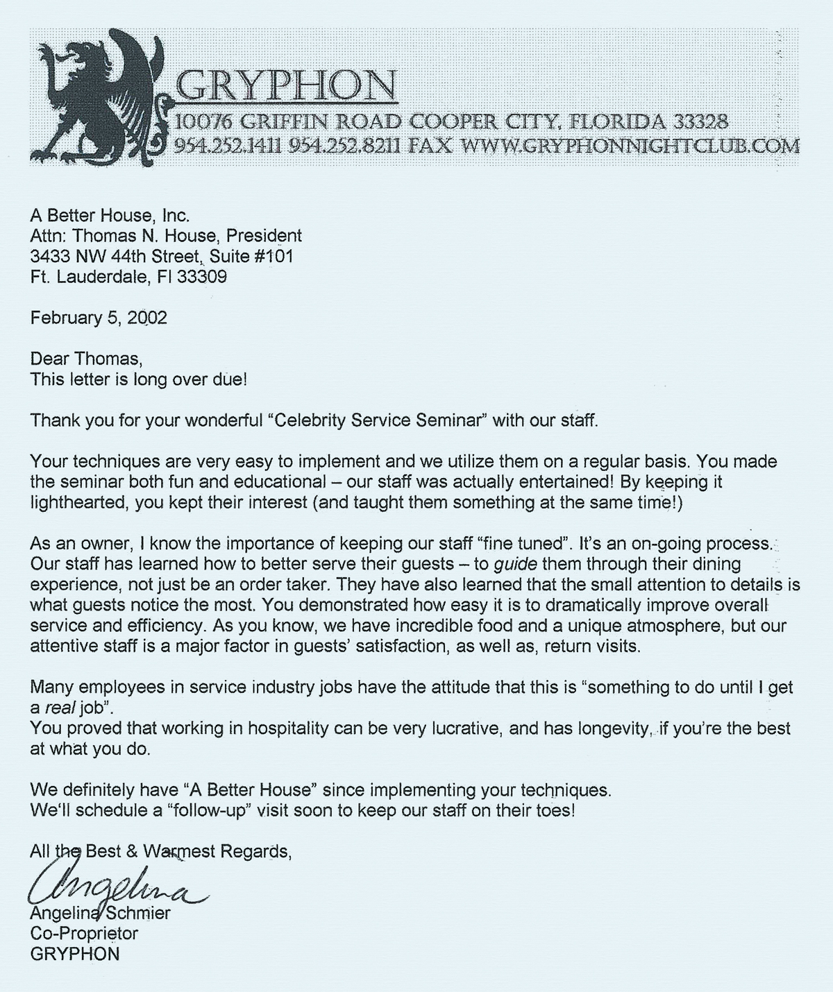 Another specialty of Tom's is to come into an already existing establishment and perform a two day complete evaluation of the operation that includes an in-depth written report. Tom can then return and work closely with all employees and management to dramatically improve sales, service and efficiency throughout the business. Inquire about Tom House's Celebrity Service Seminars, which are guaranteed to improve sales and service after a single two hour training session. Under Cover Evaluations / Shopping Services are available for any size Restaurant or Nightclub operation. By utilizing Tom's proven methods, your restaurant or nightclub will become A Better House, able to operate more efficiently and profitably going forward.