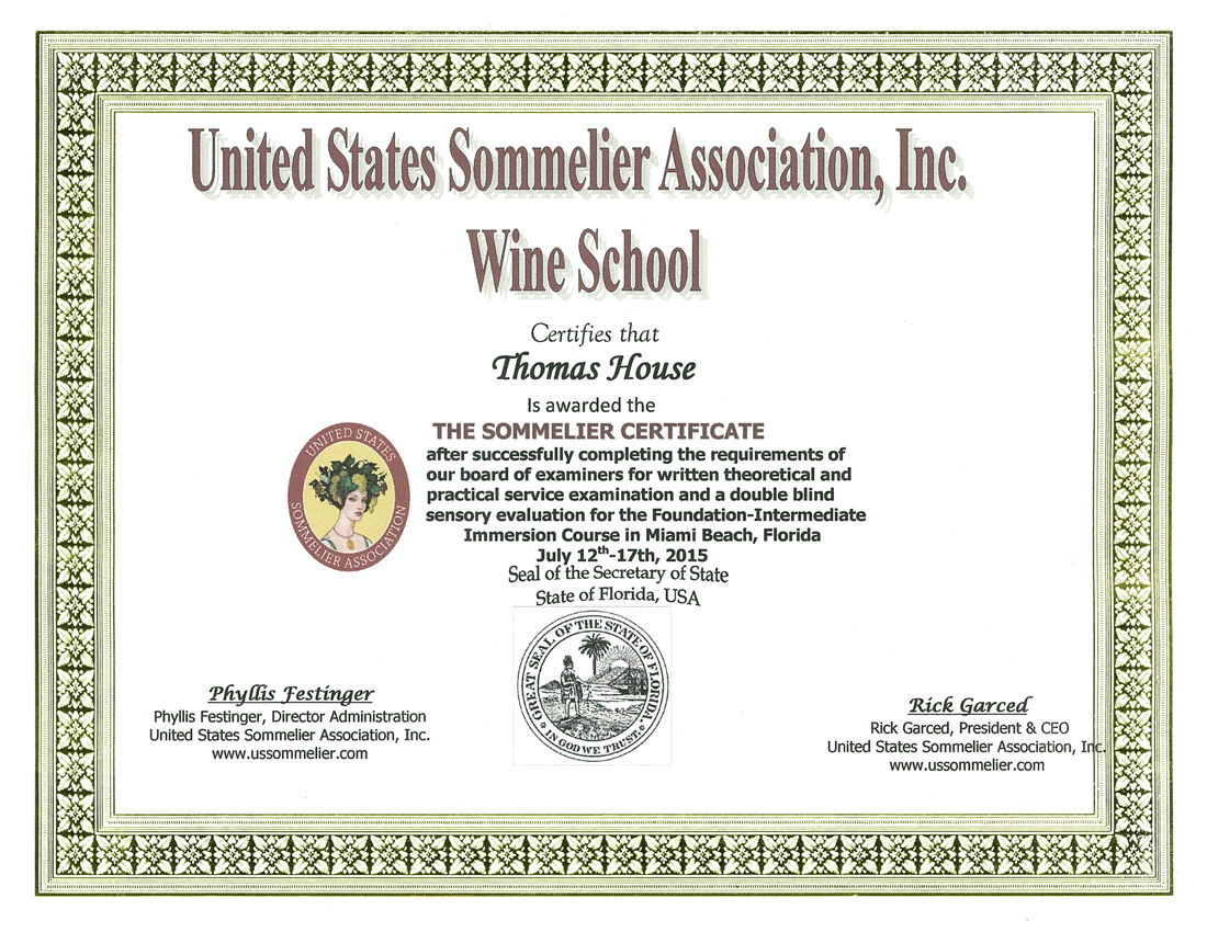 Certified Sommelier; Club Wine Service and Decanting, Certified International Food Service Manager, Tableside Cooking Expertise, Including Flambé, Fine or Casual Dining Expertise, French Service, Celebrity Service Seminars, Sales Techniques, Proper Etiquette, Safe Food Handling, Mixology and Booking Live Entertainment.