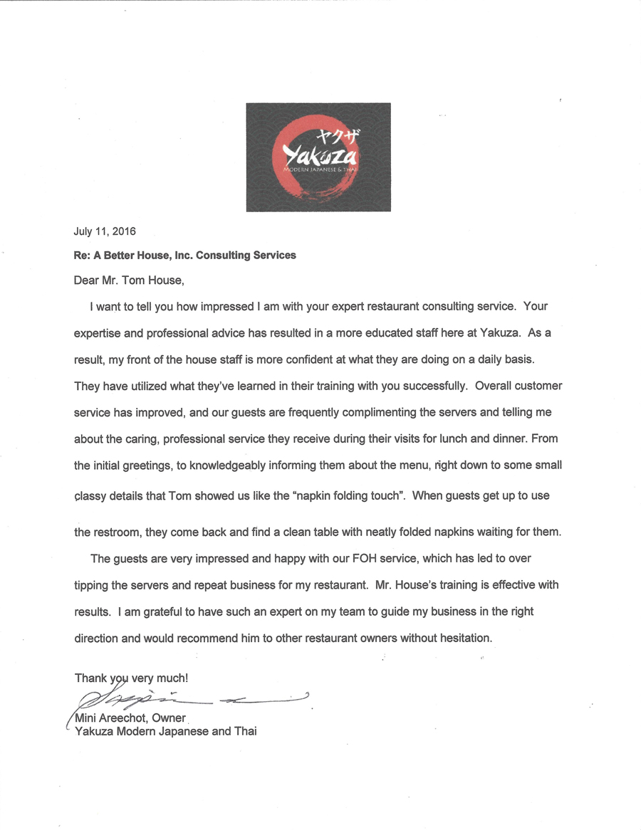 The hottest newest restaurant in Pompano Beach, Fla Yakuza owners brought Tom House in for staff training and fine tuning of the front of the house service, including bartending and table service. Tom continues to work closely with the owners solving problems as needed.