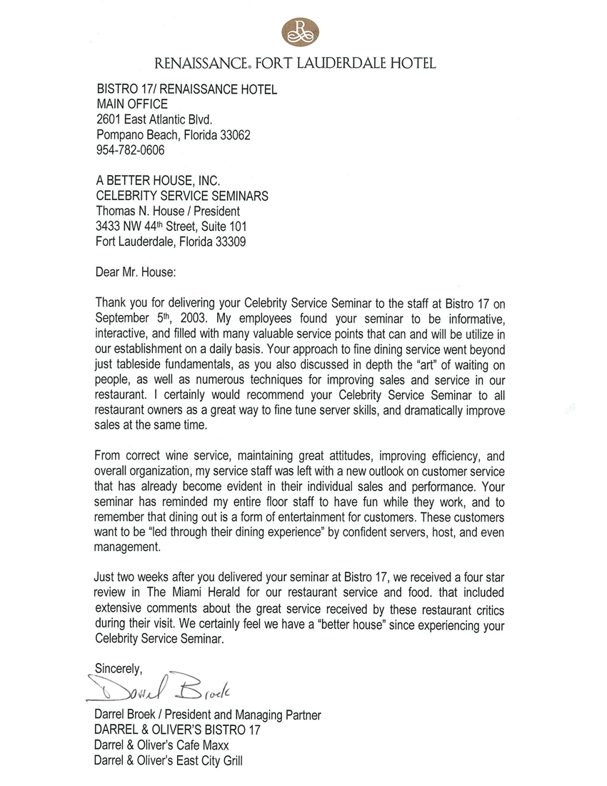 "Just 2 weeks after Tom delivered his Celebrity Service Seminar at Bistro 17, we received a 4-Star Review in The Miami Herald for our restaurant service and food. I recommend his program to all restaurants."